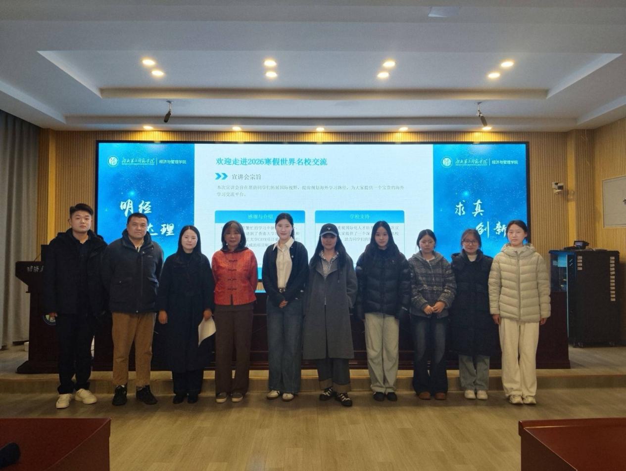 本网讯(通讯员 王雨竹)2025年12月4日晚,由经济与管理学院主办的“2026年寒假世界名校交流项目宣讲会”在2号楼三楼报告厅成功举办,吸引了百余名学生积极参与,现场反响热烈。